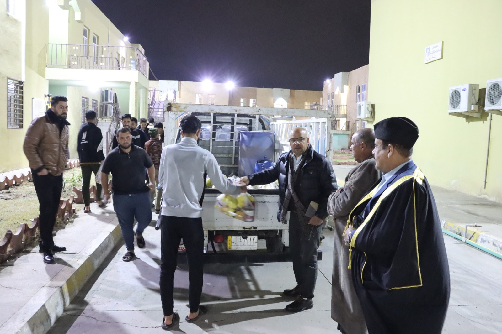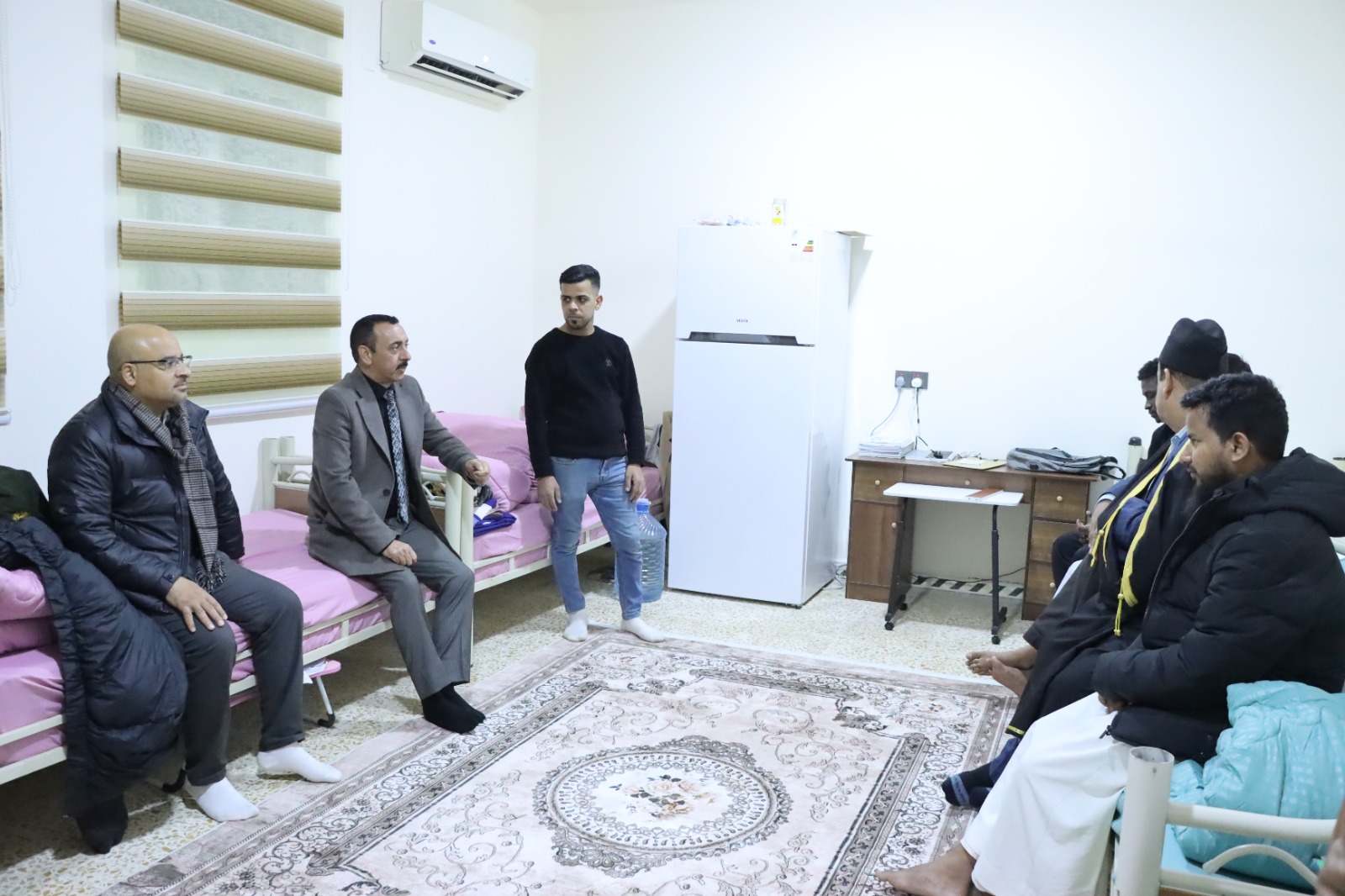 في إطار حرصه على متابعة أوضاع الطلبة عن كثب، وتفقد الخدمات المقدمة لهم ، قام السيد عميد كلية التربية للعلوم الإنسانية الاستاذ الدكتور عماد حميد احمد برفقة السيد معاون العميد للشؤون الإدارية الاستاذ الدكتور عادل صالح علاوي ،والسيد معاون العميد لشؤون الطلبة الاستاذ الدكتور مثنى مشعان خلف ، مساء اليوم الاثنين الموافق (٢٠٢٦/١/١٩) بزيارة الأقسام الداخلية للبنين ، للاطمئنان على الظروف المعيشية والخدمات المقدمة للطلبة، وتقديم (سلات غذائية) لهم ، والاستماع إلى آرائهم ومقترحاتهم، فضلاً عن الوقوف على أبرز احتياجاتهم ومتطلباتهم، والتقى السيد العميد خلال زيارته بالطلبة الاجانب المقبولين ضمن برنامج "ادرس في العراق" واستمع لهم لدعمهم والوقوف على الاحتياجات اللازمة لهم ، تأكيداً لاهتمام عمادة الكلية بتوفير بيئة دراسية ومعيشية مناسبة تساند الطلبة في مسيرتهم العلمية.