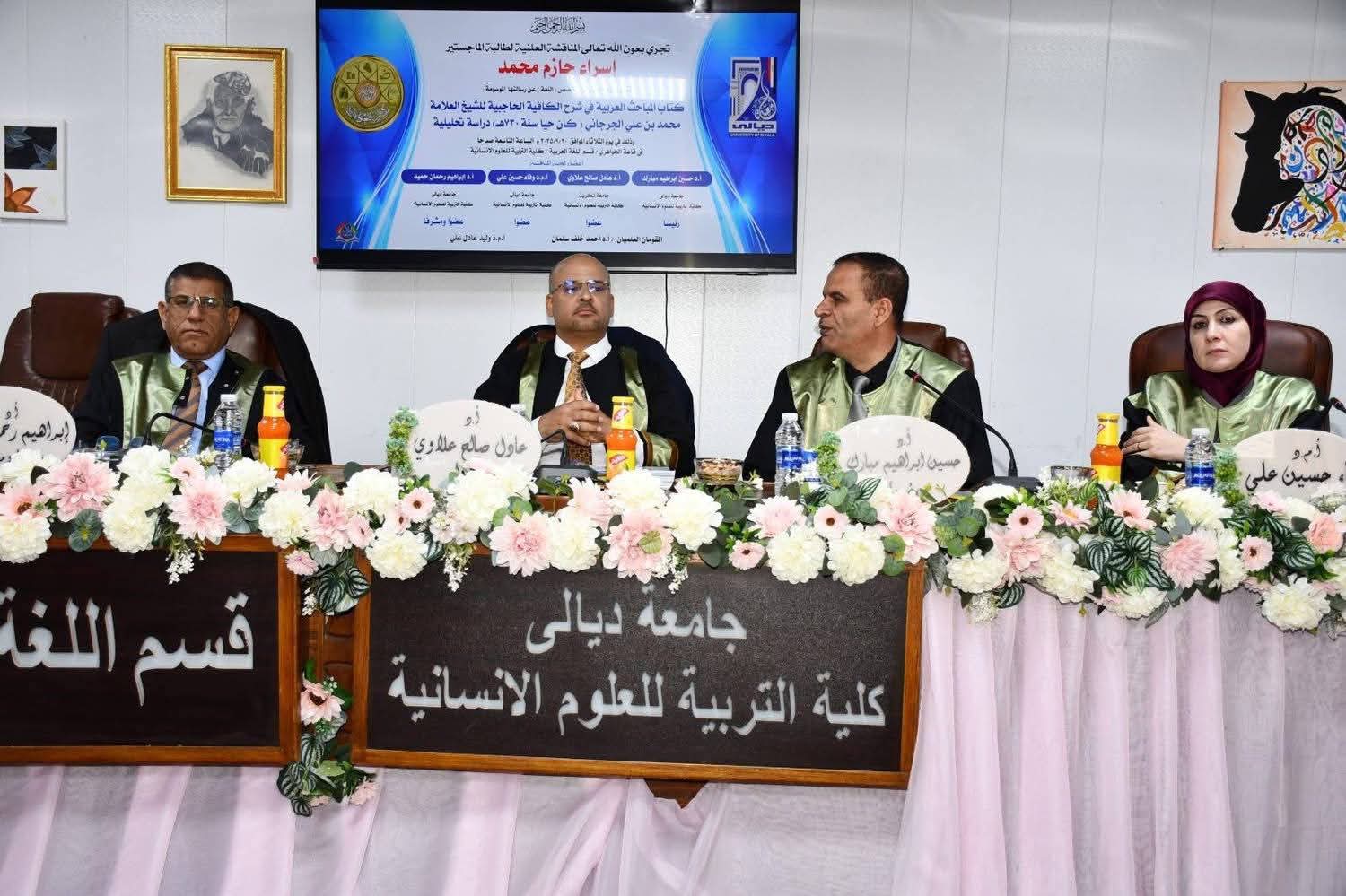 شارك السيد معاون العميد للشؤون الإدارية الاستاذ الدكتور عادل صالح علاوي في عضوية لجنة مناقشة رسالة ماجستير في جامعة ديالى - كلية التربية للعلوم الإنسانية للطالبة (اسراء حازم محمد) عن رسالتها الموسومة (كتاب المباحث العربية في شرح الكافية الحاجبية للشيخ العلامة محمد بن علي الجرجاني - دراسة تحليلية).