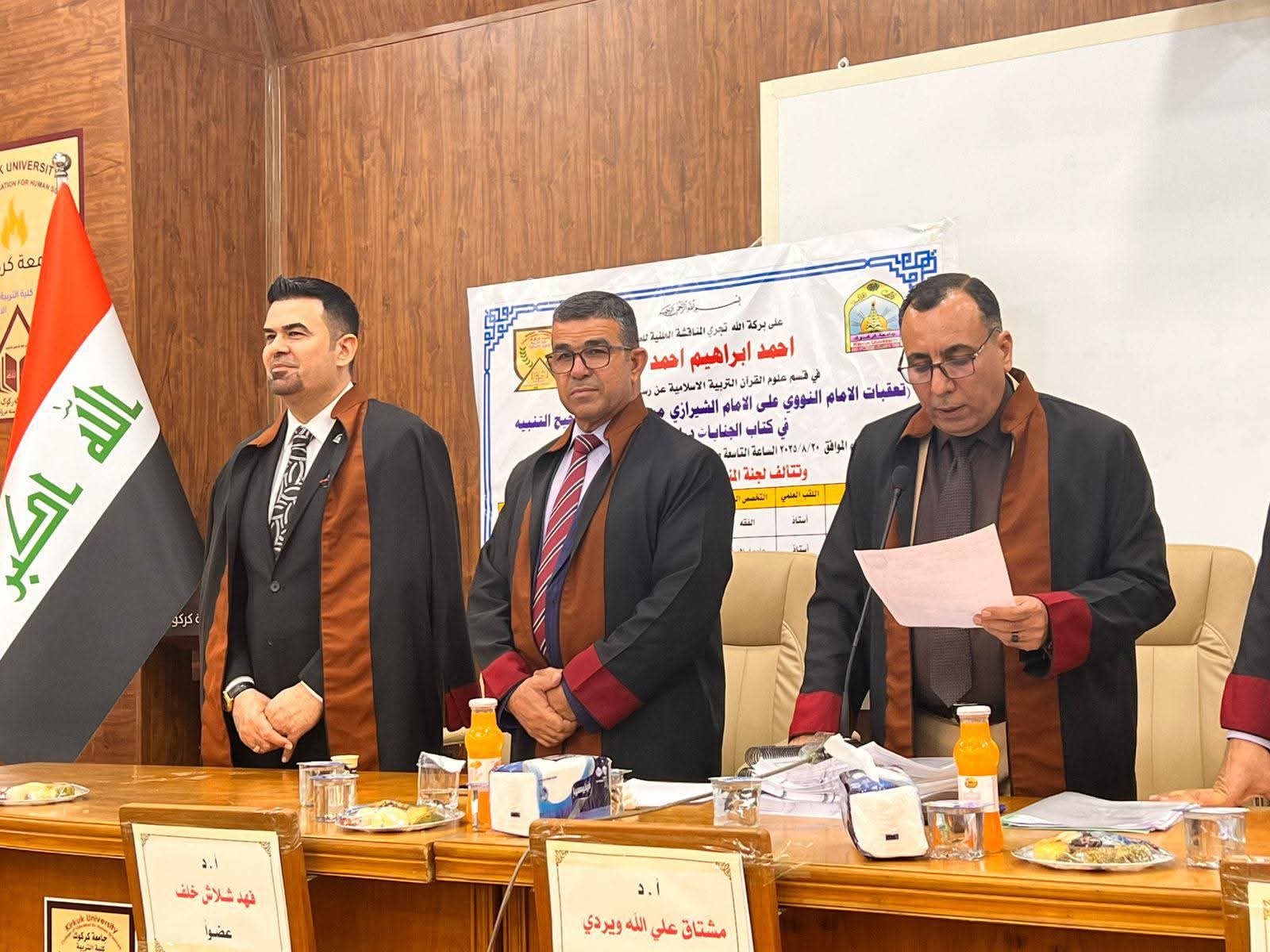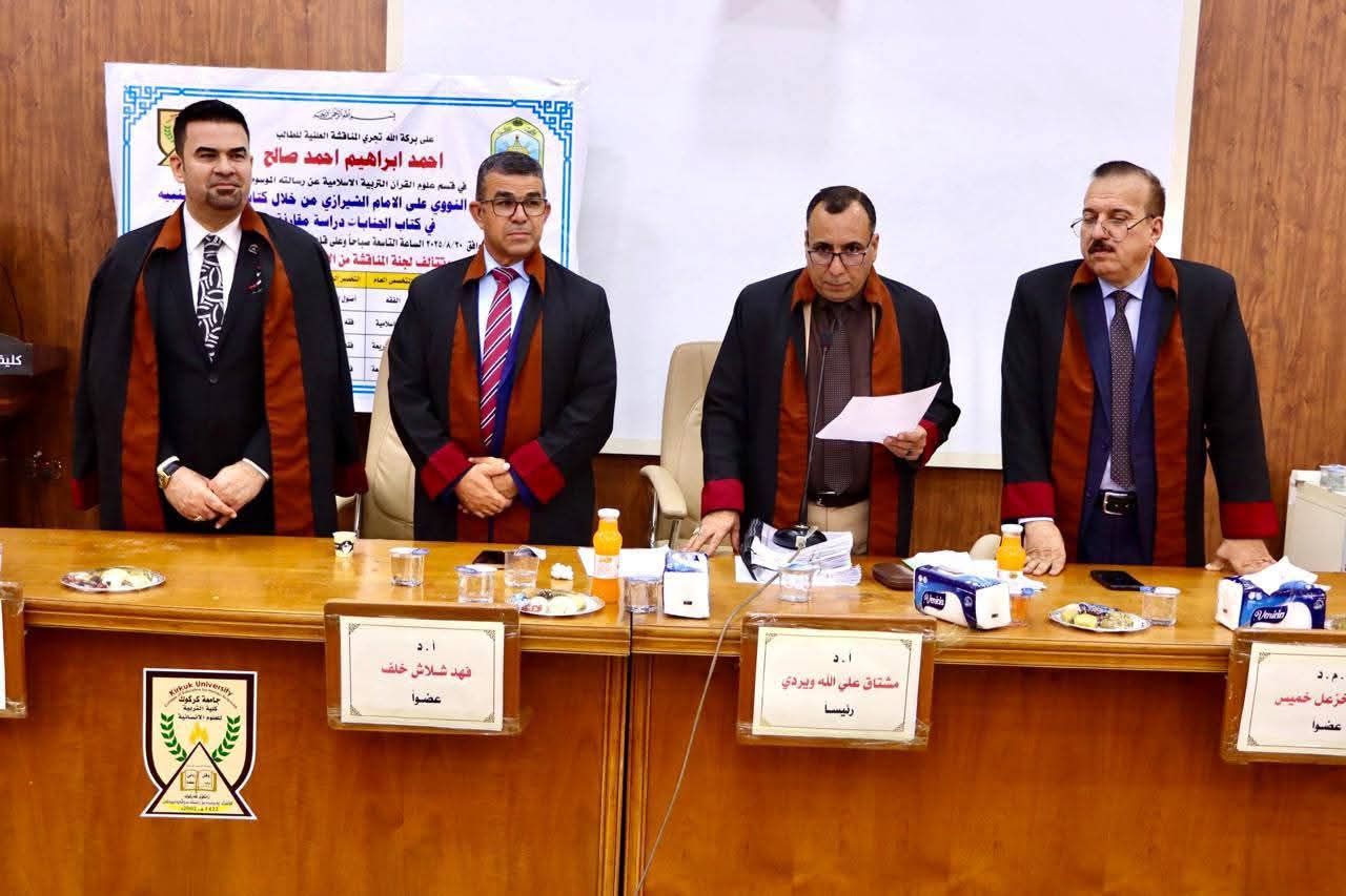 شارك الاستاذ الدكتور فهد شلاش خلف التدريسي في كليتنا قسم علوم القرآن والتربية الإسلامية في عضوية لجنة مناقشة رسالة ماجستير في جامعة كركوك - كلية التربية للطالب (احمد ابراهيم احمد ) عن رسالته الموسومة (تعقبات الامام النووي على الامام الشيرازي من خلال كتابه تصحيح التنبيه في كتاب الجنايات - دراسة مقانة).