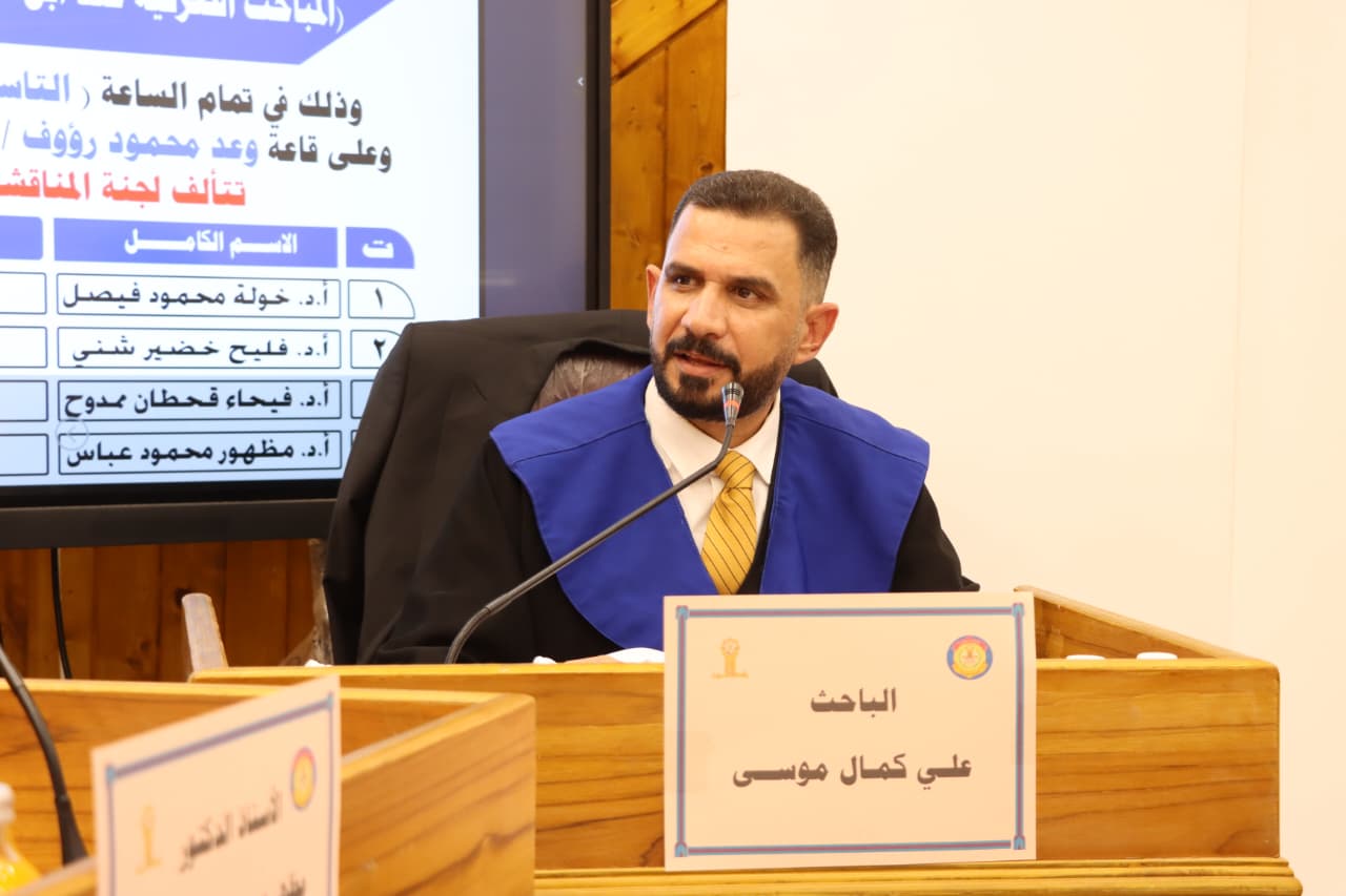 نوقشت في كلية التربية للعلوم الإنسانية قسم اللغة العربية اليوم الاثنين الموافق (20/4/2026) رسالة الماجستير لطالب (علي كمال موسى) الموسومة (المباحث الصّرفيّة عند ابن المَلَك الرّوميّ (ت 854هـ) في كتابه شرح مصابيح السُّنَّة).